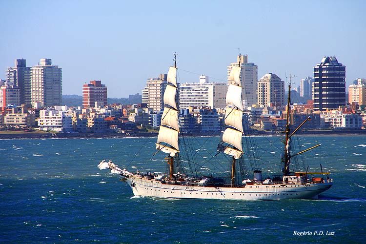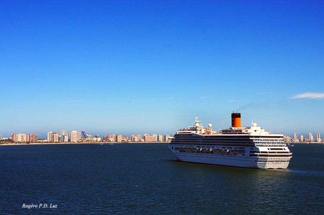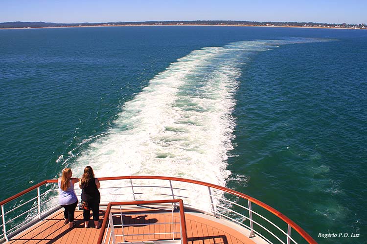 Não há porto para embarcações de grande porte, assim o navio fica ancorado em alto mar e seus barcos nos transportam para um pier numa praia próxima ao centro comercial. Dizem que se o mar estiver muito agitado ou em mau tempo, a alternativa é o porto de Montevidéu. Por sorte, o dia estava lindo, céu azul, o mar tranquilo, e assim descemos do Armonia por uma escada até que segura apesar de um certo receio pela altura, já que estavamos em alto mar, e embarcamos num barco salva-vidas fechado. Como já tinhamos contratado um city tour no navio, já no pier havia orientação para apanharmos o ônibus/autocarro e rumamos para um gostoso passeio que teve uma parada num belvedére, a Casapueblo que optamos, e no final uma parada rápida no centro para compra de souvenirs (Made in China, em geral).
